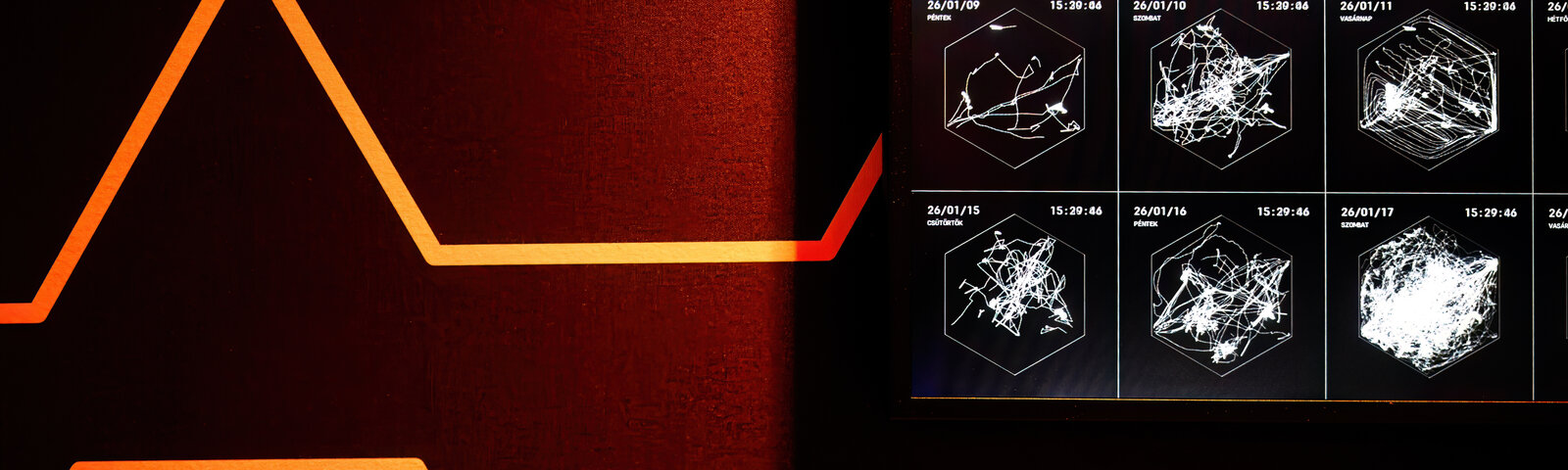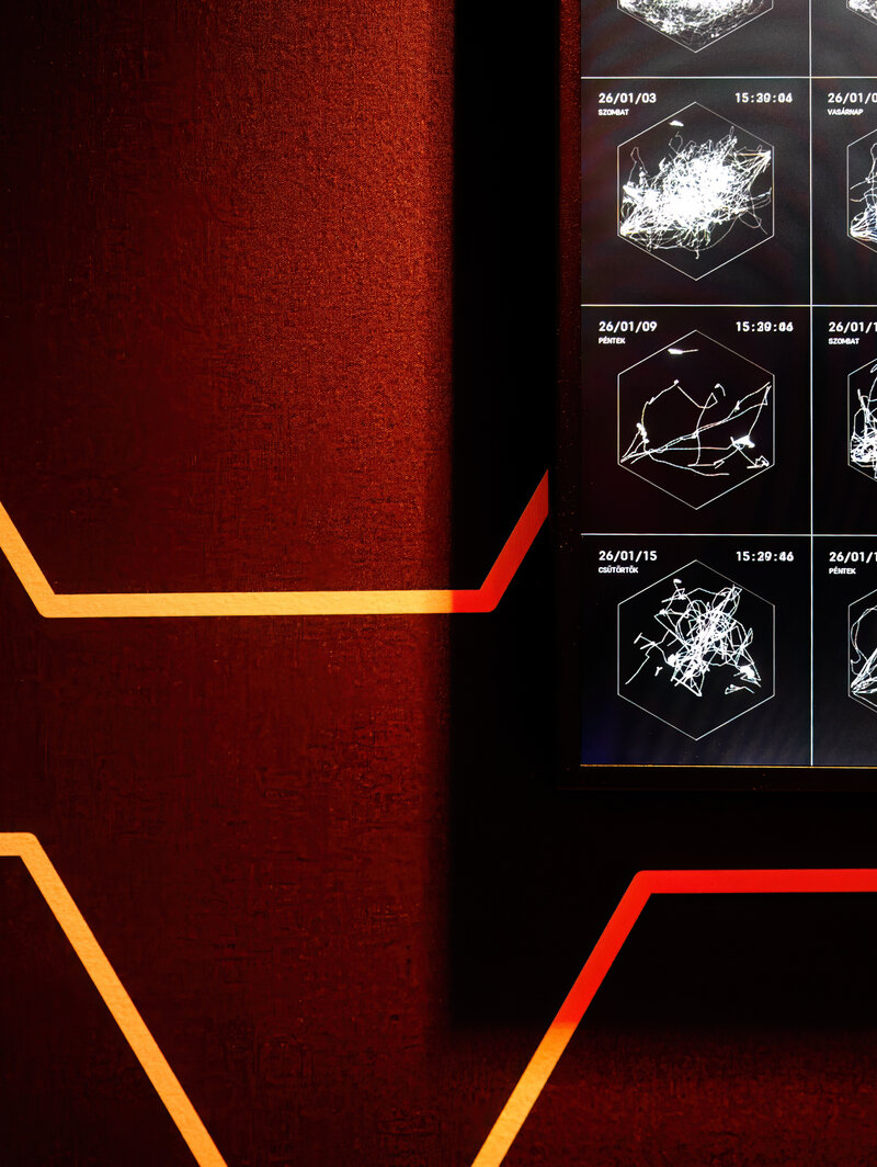 Absztrakt, vizuális formában kiolvasható belőle például, hogy egy adott napon hányan voltak a térben, és pontosan mikor voltak a legaktívabbak a látogatók. Ez egy izgalmas plusz réteg: az így keletkező adatok kontextusba helyezik a Hexagon világát. Maga a technológia is az adatvizualizációra épül, amely különösen közel áll hozzám. Legyen szó egzakt mérőszámokról vagy elvontabb mintázatokról, az adatok segítenek abban, hogy az immerzív tér működése érthetőbbé és „olvashatóbbá" váljon. A kávézóban a Flowlands esetében a mozgás inkább hangulatként jelenik meg, absztrakt vizuális nyelven, itt viszont információvá válik – adatokként, adatvizualizáció formájában –, sőt akár edukatív módon is. A közös pont mindkét esetben ugyanaz: a térben zajló mozgást tesszük láthatóvá, csak más nyelven.