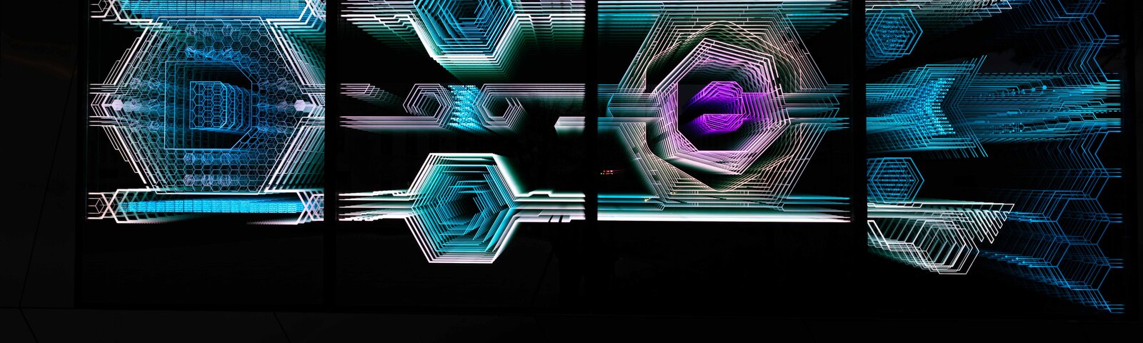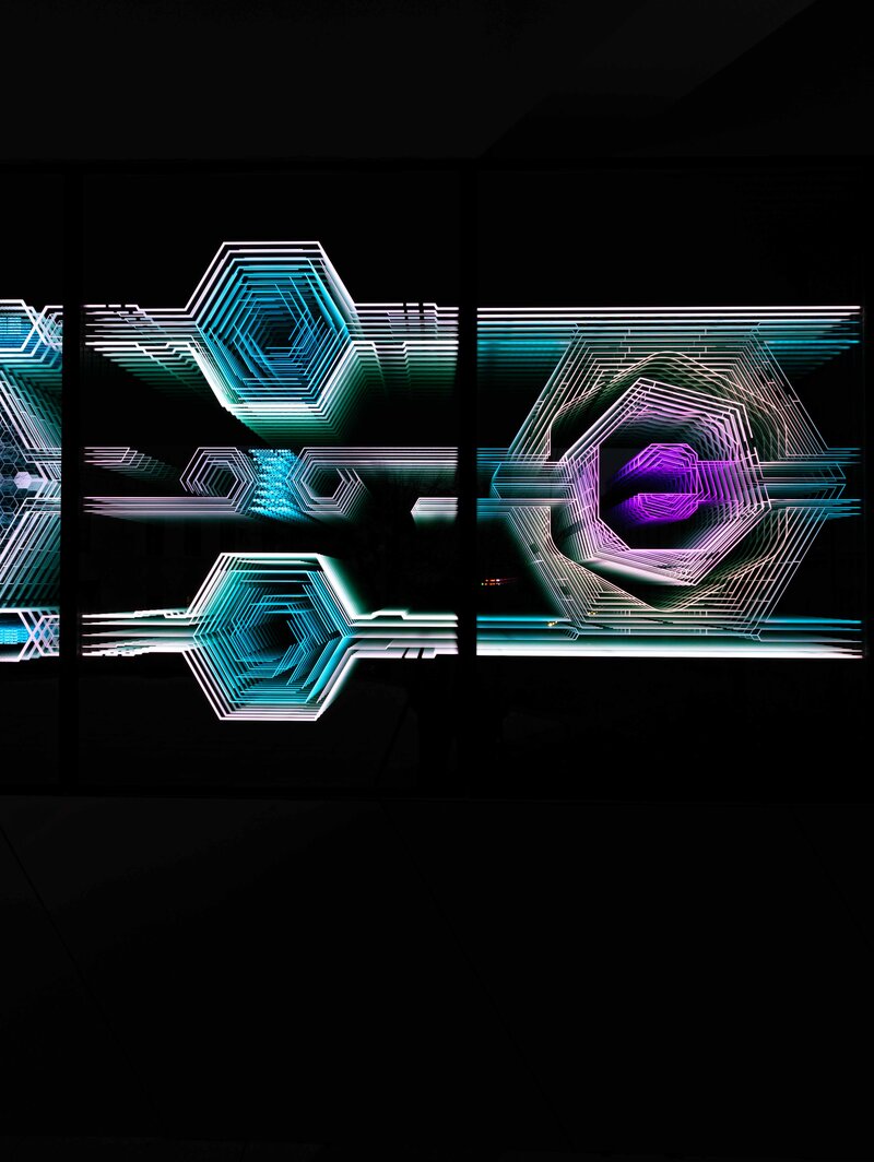 Amit még szerettünk volna mindenképp megjeleníteni a munkában, az az épület új funkciója szerinti vezérgondolatok megjelenítése. Már korábban is volt példa rá, 1-1 munkánknál, hogy kódoltunk 2-es számrendszerben bizonyos üzeneteket, ezt itt most azzal bonyolítottuk, hogy 0, és 1 számjegyek helyett üres és teli hexagonokat használtunk a kódoláshoz. Maga a kódolás, mint számítógépes nyelv az épület digitális élményközpont voltához, és a digitális fényművészethez ilyen módon is kapcsolódik, de az üzenetek is kapcsolódnak az új funkcióhoz.