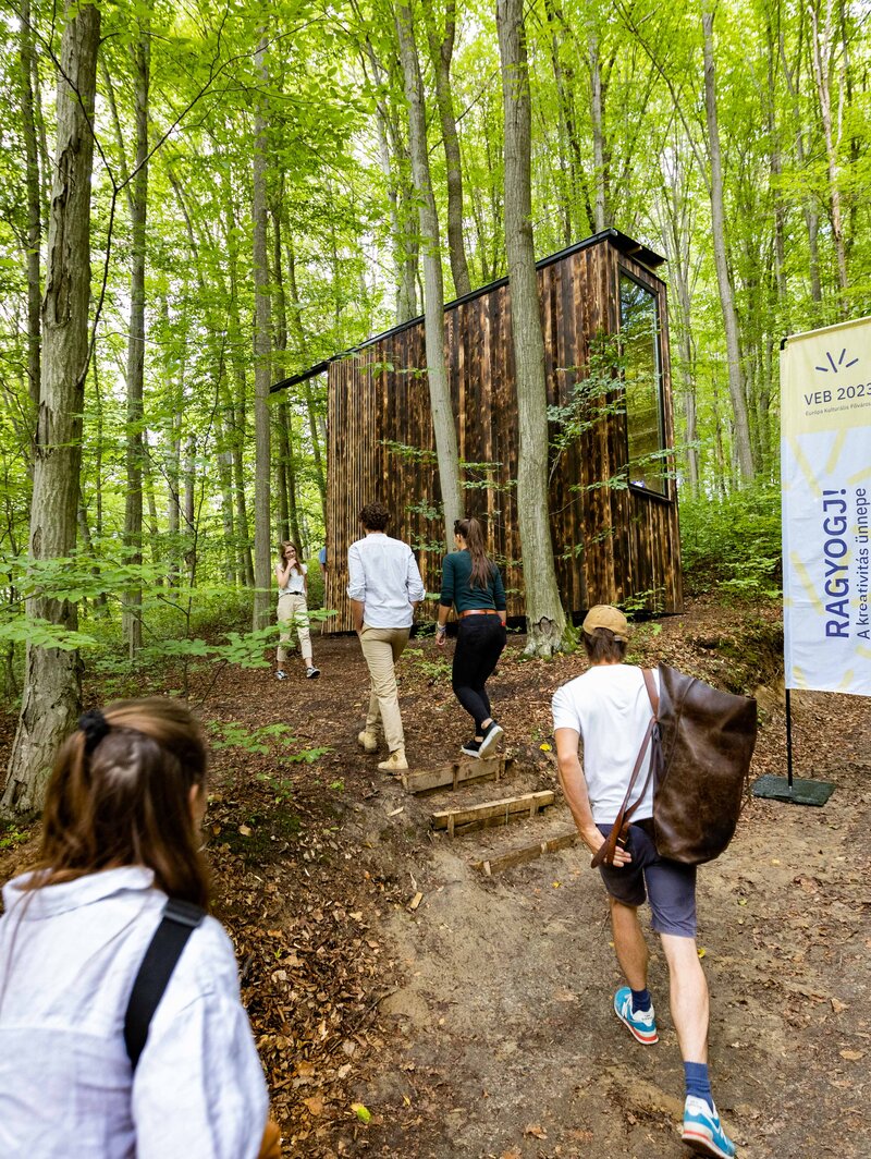A Csinger-völgy közelében található különleges erdei kabin egyszerre könyvtár és menedék. Az üvegfallal nyitott faszerkezet pihenésre és olvasásra hív, polcain irodalmi és ismeretterjesztő művek sorakoznak. A MOME hallgatói által 2022-ben épített, égetett deszkaborítású építmény harmonikusan illeszkedik a bükk- és gyertyánfák közé. A Veszprém-Balaton 2023 Európa Kulturális Fővárosa program részeként jöhetett létre, a Kristály-völgy Egyesület pályázatának részeként.