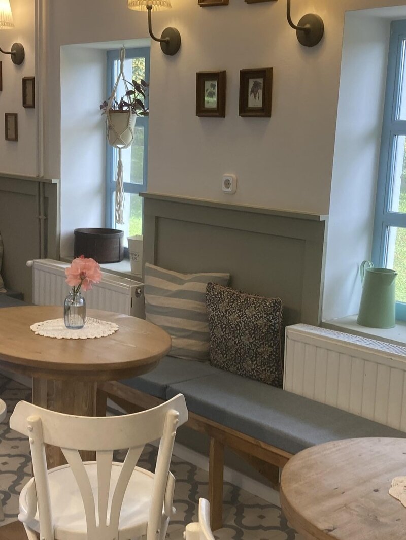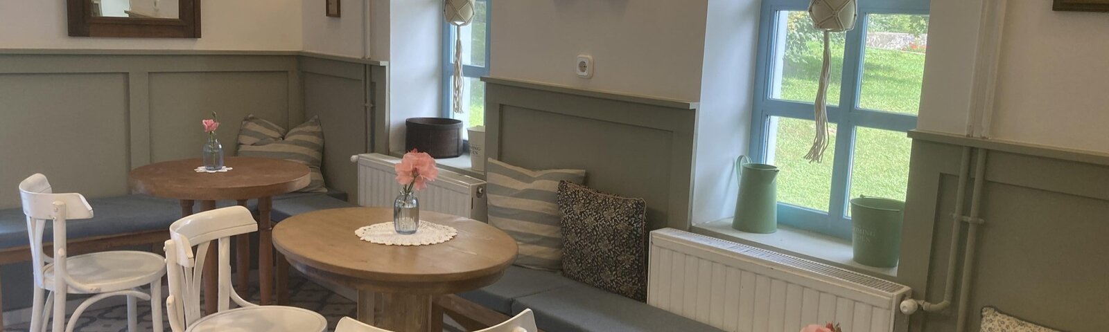 A romantikus hangulatú fehér falú, türkizkék nyílászárós épület és a kuckós belső tér tökéletes helyszín egy nyugodt reggelihez vagy délutáni kikapcsolódáshoz. Nyáron a teraszról csodás kilátás nyílik a zöld környezetre, miközben a gyerekek játszhatnak a kialakított játszótéren.